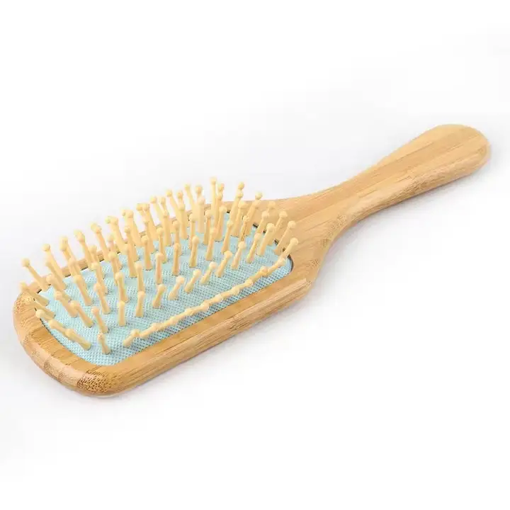 Discover our eco-friendly hairbrush with a bamboo handle and wooden bristles, designed for sustainable hair care with a unique blue silicone design.