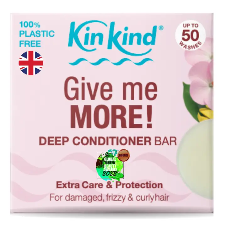 Give your hair the extra care it deserves with KinKind Give me MORE! Deep Conditioner Bar. Silicone-free formula enriched with cocoa butter and coconut oil for extra smoothness, softness, hydration, and shine. Perfect for curly, frizzy, and damaged hair. Curly Girl Method approved.